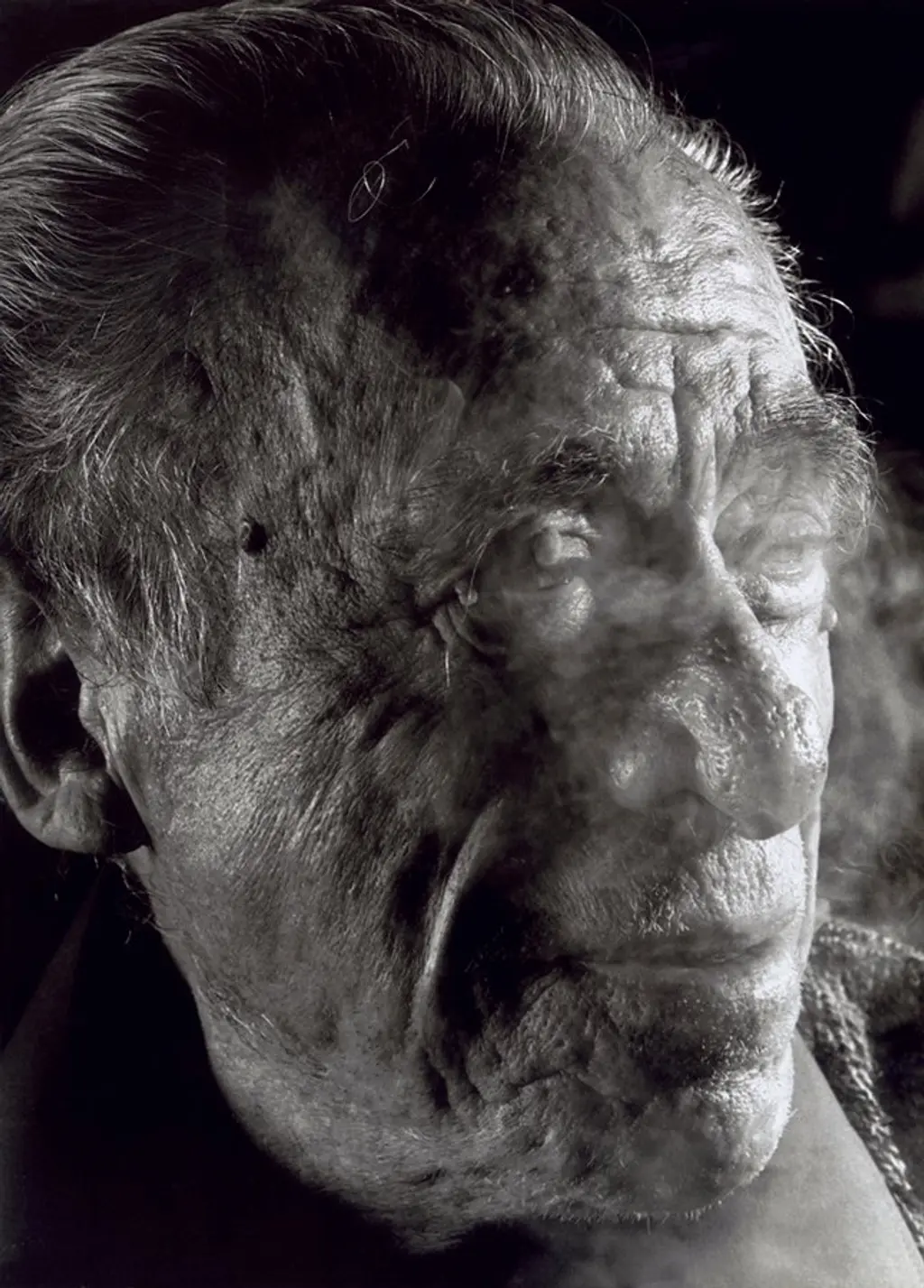 Thus we find Andy Warhol, the self-portraying showman who had countless "last pictures" taken of him before he died, in a pose which does indeed recall a terminal stage; Arno Breker appears, with, of all things, a Joseph Beuys portrait in his hands. Carl Barks, the draughtsman who drew Donald Duck, is presented with a mischievious grin, not so different now from his own cartoon figures. William S. Burroughs faces us at gunpoint, peering from behind the pistol now menacingly watchful, now as if he were his own victim. Roland Topor peer enigmatically heavenward, eyes huge. Lech Walesa, cut at the edge of the picture to the right, has outgrown the format with his fat self-satisfying inflatedness, and Charles Bukowski's lifeworn face is more like a landscape of craters swathed in cigarette smoke.