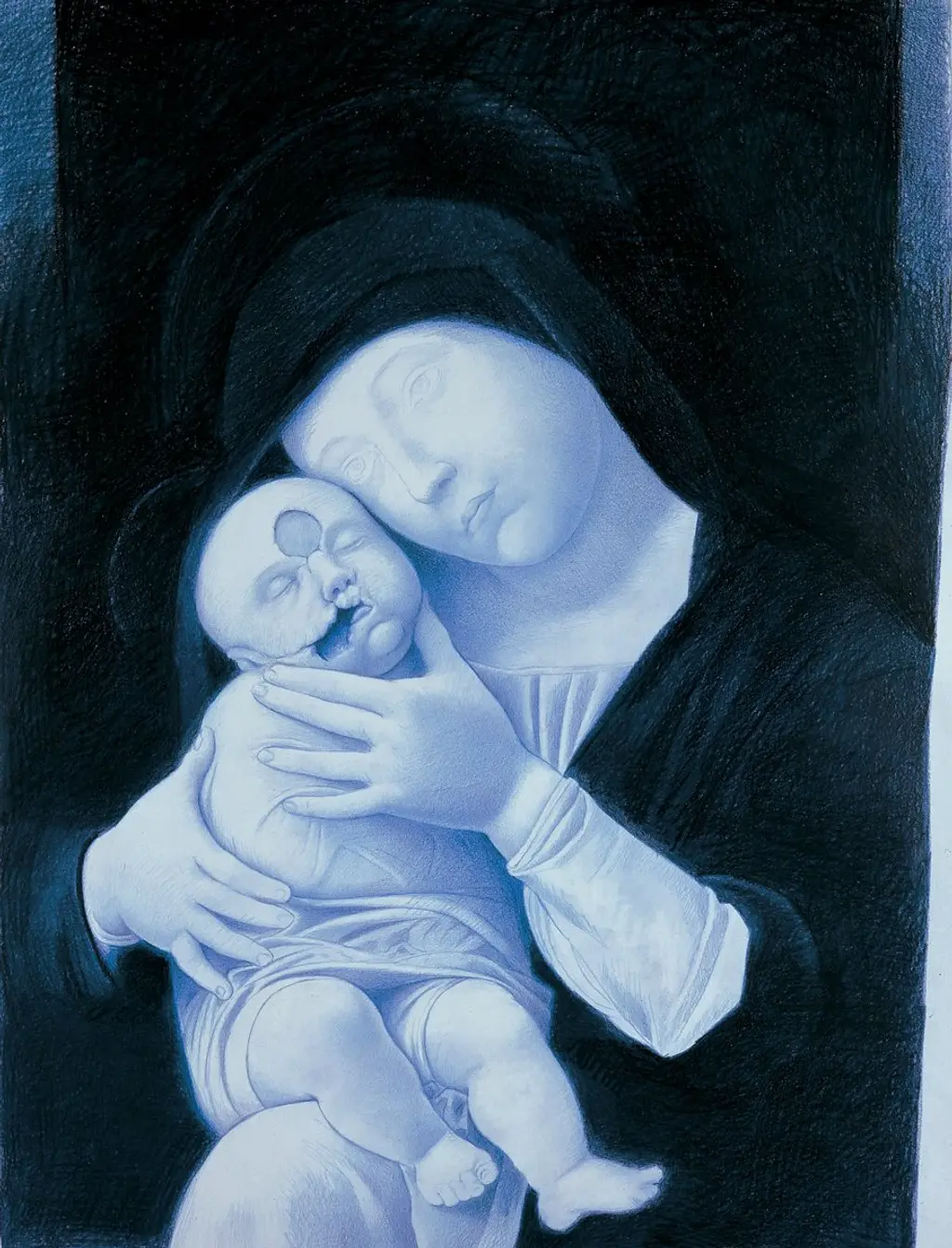 In den 80er Jahren strafft Helnwein die Lichtenergie. Ihre Kraft wird zur Gewalt. Explosionsartig durchwaltet das Licht den Raum und wird zum Agens gegen den Menschen ("Vertreibung aus dem Paradies"). Im "Judaskuss" wird es personenhaft: leuchtend, erleuchtend, lebend, mitfühlend und zerstörend zugleich. Man betrachte das Ereignis aus der Nähe! Das Höchstmaß an Spannung im Kopf des Kindes und blendende, strahlende Helligkeit, die nach allen Seiten austreibt, bringt selbst den umgebenden Raum, der wie ein Halo die Figuren umgibt, zum Erzittern. Das Urbild des Judaskusses macht Helnwein zu einem Zerrbild, das zugleich als Deutungszeichen gesehen werden sollte, das zur Besinnung, zur Reflektion auffordert. Der Denkvorgang selbst wiederum schafft trotz der drastischen Darbietung Distanz zum Bild, die auch im Vollzug des Zeichners angedeutet ist. Einerseits markieren die Federstriche die konkrete Form des Gegenstandes, anderseits entzieht sich das Motiv der realistischen Sehweise durch den bewussten Sinneseinbruch des einzelnen Federstrichs in den Schraffuren, deren Struktur Körper und Raum zu einem dichten Gitternetz miteinander verweben. Die Doppelbödigkeit des Inhalts ist charakterisierend durch dieses ambivalente Zeichenverfahren, bei dem wir Beides zu gleichen teilen wahrnehmen, die Darstellung selbst und die Handschrift des Zeichnenden.