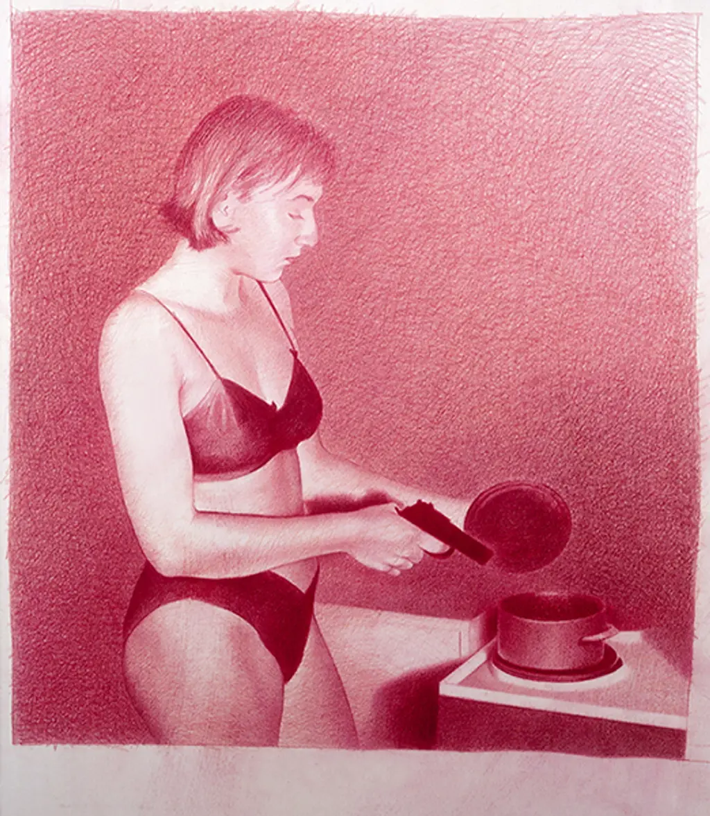 Mehr auf den Zusammenhang von Form und Inhalt abgestimmt und nicht so stark konturbezogen, sind die Zeichnungen der zweiten Hälfte der 70er Jahre. Figur und Raum werden von einem flächendeckenden Netzt überzogen, wobei jedoch immer das unmittelbar Handschriftliche sichtbar bleibt. Dichte gekritzelte Striche bilden eine Flächenstruktur aus hochdifferenziertem Überlagerungen und Durchdringungen und werden dadurch zu einer Art Radierstrich, hauchzart, samtig, weich, aber auch hart, gebündelt, rissig und spröde. Die dünnen Linien ergeben ein Gespinst von ungeheuer Bewegung und interpretieren in festen oder transparent durchsichtigen Flächen den Raum als einen Stimmungsraum mit dramatischen Lichteffekten, die in einen tonigen, seidigen Glanz übergehen können. Oft kommt es vor (>>Du hast einen großen Mund<<), dass die Federstriche über den Gegenstand hinweg gehen und nicht fixieren.