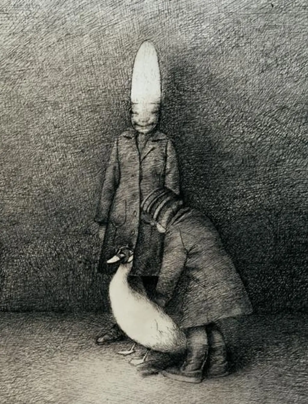 Das reine Weiß des Blattgrundes, das als Bildfaktor mitwirkt, steigert die Intensität der hart abgrenzenden Federstiche, die Figuren scherenschnittartig herausstellen. Die entleerte Bildfläche wird gleichsam zur Metapher des Ausgesetztseins. Weitgehend unterstützt wird die formale Verfremdung durch die darstellende Form der Linie, die zwar den Bewegungsablauf, Licht, und Schatten bezeichnet, nicht aber die in der Tiefe führende Körperlichkeit und die dreidimensionale Durcharbeitung. Sie bleibt eher an der Oberfläche gebunden, bildet weitgehend willkürlich gesetzte Parallelschraffuren, in der Verdichtung Grauwerte und Schwärzen mit abrupten Übergängen, ohne auf die Körpermodulation einzugehen. Die starke Inkongruenz von Körpervolumen und Form lässt sich am Schriftzug der Feder gut verfolgen, der sich der genauen Markierung des Stofflichen entzieht und immer als Einzelduktus wahrnehmbar bleibt. Da Helnwein nicht stilisieren wollte, genügte im diese Form als bloße Bezeichnung des Gegenständlichem.