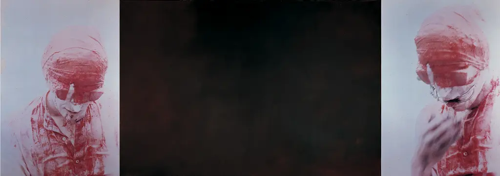 The self-portrait for the artist's blindfolded unbent head covered with blood occurs twice in his triptych THE SILENT GLOW OF THE AVANTGARDE (1986). The middle panel shows an enlarged reproduction of C.D. Friedrich's POLAR SEA, a depiction of a catastrophe of 1823/24 which is generally interpreted as a romantic allegory of the force of nature overpowering all human effort . Helnwein compared the "quietly theatrical" ecstatic attitude of his self-portrait with the heroic pose of the figure of the suffering figure of Sebastian and generalizes both to the stigma of the artist in the 20th century, making him a kind of saviour figure. In addition, its poetic title sets the viewer onto the right track. The visual montage of the modern artist as Man of Sorrows with Friedrich's landscape painting projects the dashed hopes of the romantic rebellion into the present, to the protest thinking of modernity, which has become introverted and masochistic, and its crossing of aesthetic boundaries.