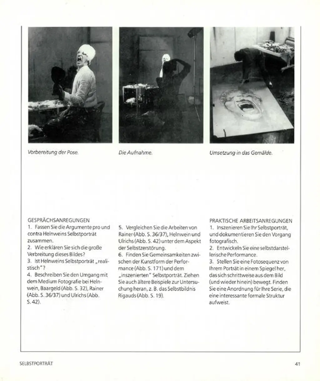 5. Vergleichen Sie die Arbeiten von Rainer (Abb. S. 36/37), Helnwein und Ulrichs (Abb. S. 42) unter dem Aspekt der Selbstzerstörung.