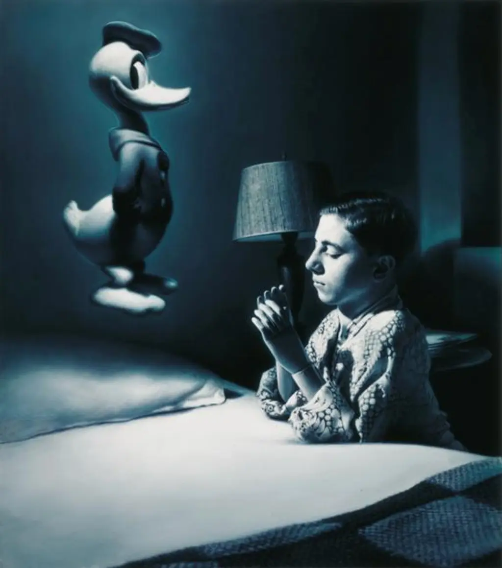 Where do Donald Duck and Mickey Mouse come into all this? Helnwein uses the strategy, known to many film makers, of juxtaposition; take a serious "adult" phenomenon such as death or sex and place it together with a picture of childlike innocence and the mental disturbance to the viewer is increased ten fold. The use of children and cartoon characters have several functions. They are not just a filmic special effect, although the paintings are particularly uncomfortable to look at for this reason; they have particular relevance to the artist both in terms of his own experiences and his concerns with some of the muffled truths of the Second World War.