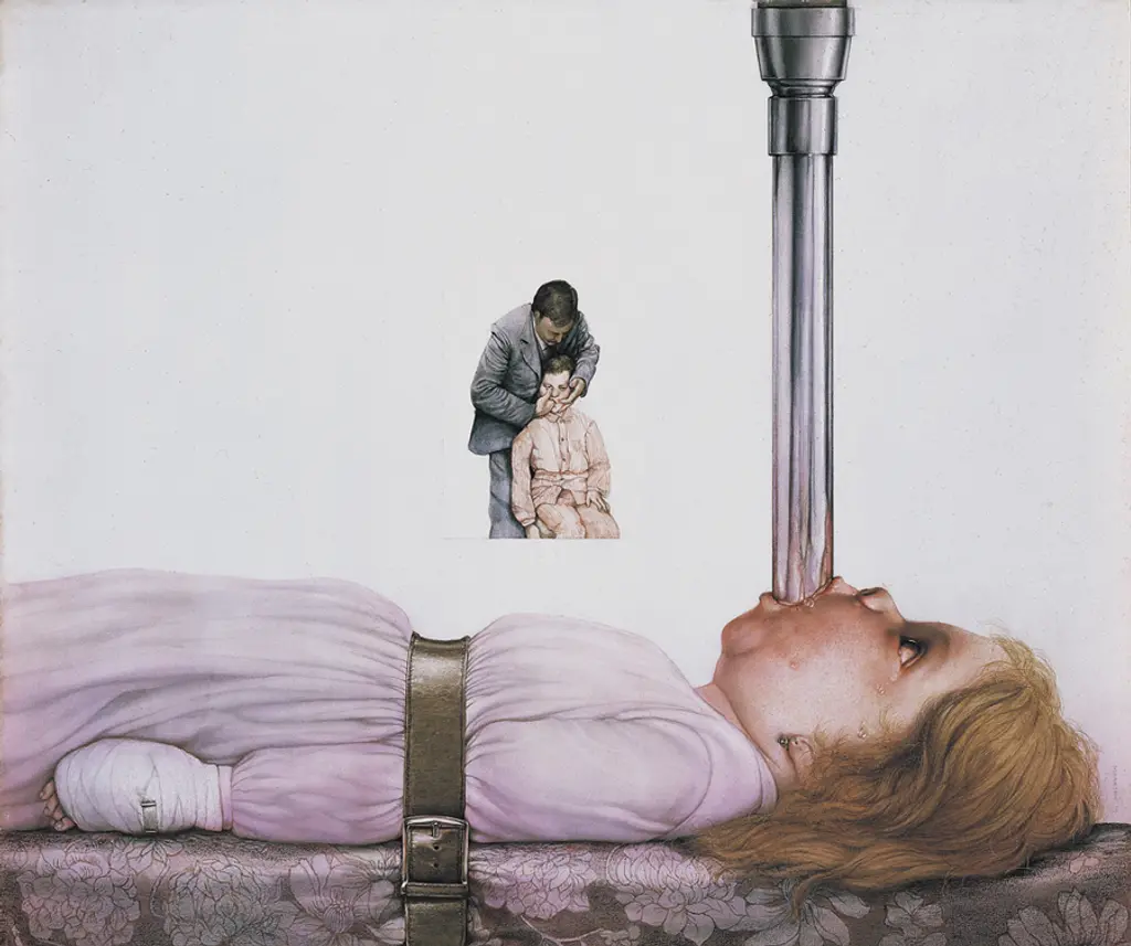 This brutal method of examination is seen through the eyes of the Austrian artist Helnwein in his painting, "The Operation" (Fig. 39). A girl, her left hand tied down, lies supine on an operating table, fully clothed. A tight leather belt about her thorax and arms has committed her to immobility. The gigantic steel tube, which coming down from above has filled the child's mouth, underscores this state of being tied down. The girl is forced, defenceless and totally awake, to endure this torture. In the background, we see a similar scene as in the photograph of the ENT textbook.