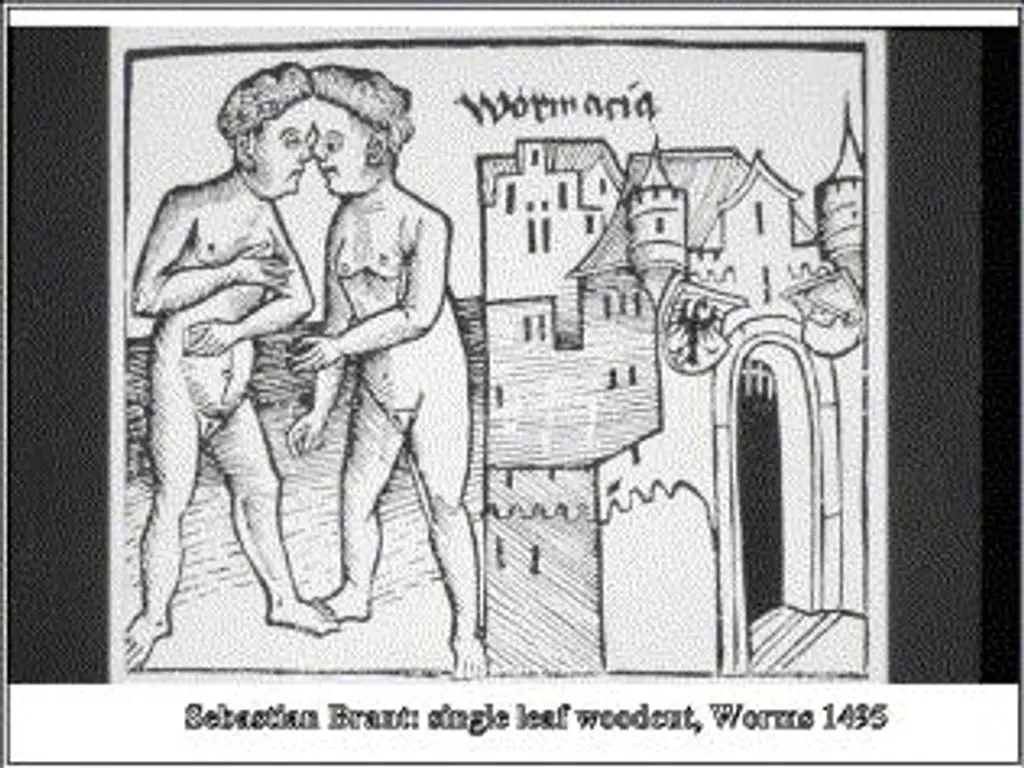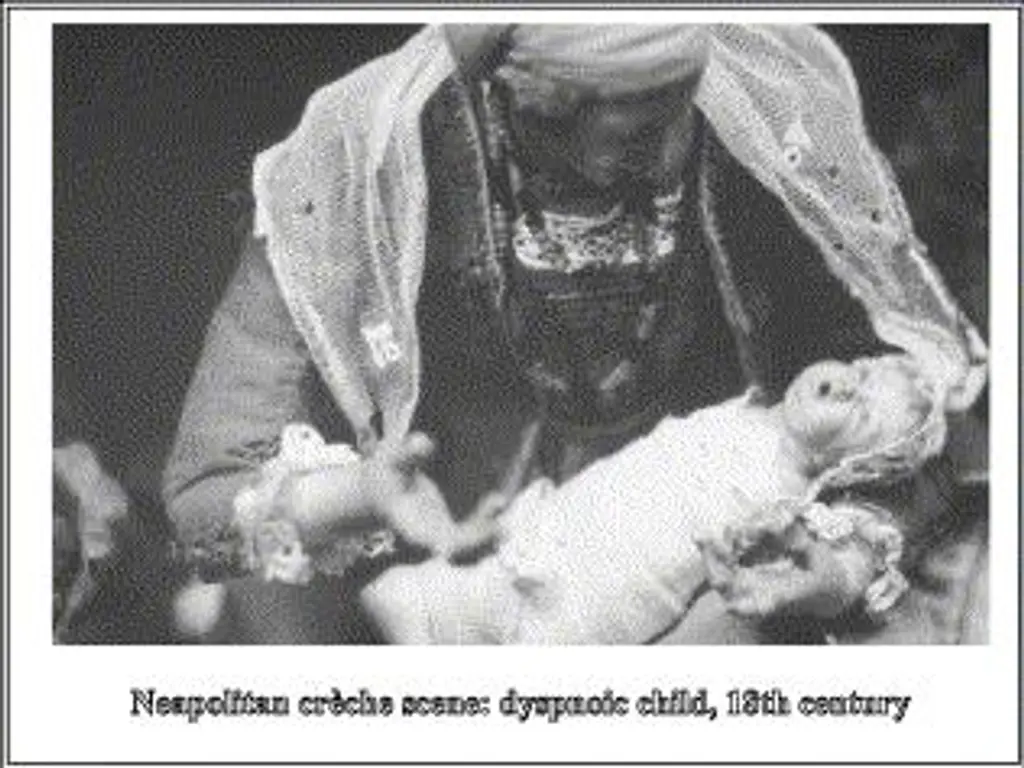 At one time, a common method of disposing unwanted and handicapped children was drowning, as shown in this illustration from Dijon (Fig. 11). Here, three women of various classes have the same goal: to hurl their unwanted children off a bridge into the swirling torrent below. The child of the woman to the right is almost drowned; only its legs and right arm are still rising from the water. The woman with the simple, blue dress is in the act of dropping her infant, weighed down with a stone, from the bridge while the richly dressed lady to the left is just stepping onto the bridge with her child in arm, in order to dispose of it "cleanly" in the river.