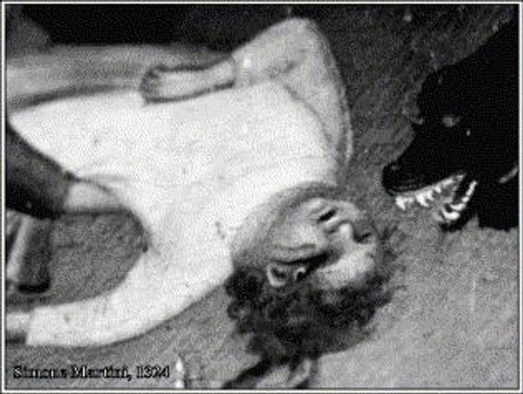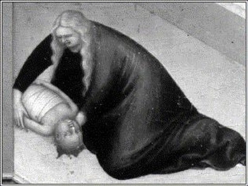 Patron saints can be helpful – in many ways. Their multifacetted assistance is shown, for example, in the "Blessed Agostino Novello Altarpiece", of Simone Martini in Siena (Fig. 54). The altarpiece is composed of a central area with Agostino and of two side areas with Agostino's miracles. I would like to focus on two miracles: a child falling out of his bed (right side, bottom) and a child being attacked by a wolf when it was playing outside the gates of the city (left side, top). The scene of the falling child shows a very early depiction of epistaxis of an infant, dated 1324 AD. We look into the bedroom of a house where a pendulous bed is hanging, the torn suspension rope having made the infant fall out. A woman in a pink dress is calling for help by turning her eyes to Agostino, who is floating down through the air from the upper right corner.