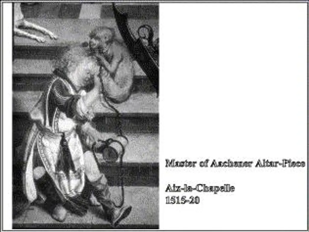 Saint Blaise, an ancient physician in Sivas in Asian Turkey, is known as a guardian of the neck: "Blaise's blessings". He performed several miracles including saving a child who had choked on a fish bone. Before his beheading, Blaise beseeched God that anyone with a disease of the throat should be healed if he prayed to the saint with the words: "Blaise, martyr and servant of Christ, said 'either go up or go down'". This recommendation goes back to the Greek physician Aetius (5th century AD) who left the text in Latin: "Blasius martyr et servus Christi dixit: aut ascende, aut descende". Saint Blaise is surrounded by putti (Fig. 13) that display his attributes: the crozier, candle, and book. In front of the bishop there lies a putto who is being menaced by a huge toad crouching on his neck. This is certainly a very original allegory of a disease entity of the neck.