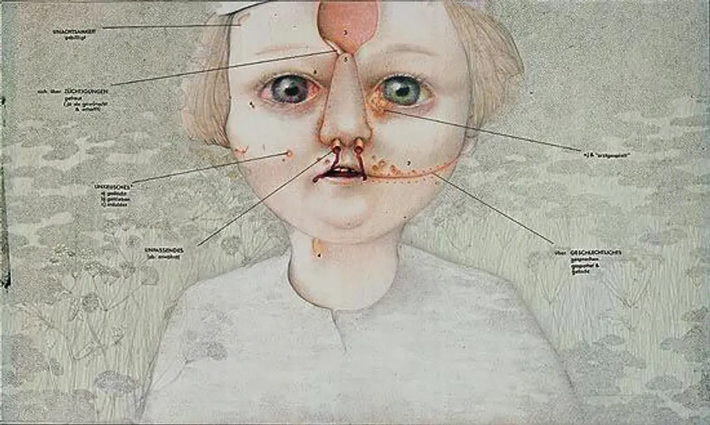 To this day, there is still controversy over when to operate on these fixed nasal deformities acquired during midfacial growth. The painting by Helnwein, entitled "Mean Child", depicts a terrified child who has just undergone a reconstructive operation to form a new nose from a frontal flap (Fig. 46). Blood drips from the tubes projecting from the reconstructed nose. A purulent scrap of granulation is seen in the left medial canthus, while a fresh scar from which the sutures have just been removed stretches from the angle of the mouth to the left ear. The flowered wallpaper in the background contains these words: disobedience allowed, taking pleasure in punishments, unchaste things, and other words which are connected with lines to the pathological alterations in the face. Do these harken back to the mediaeval belief that sickness is a punishment for greater or lesser human failings?
