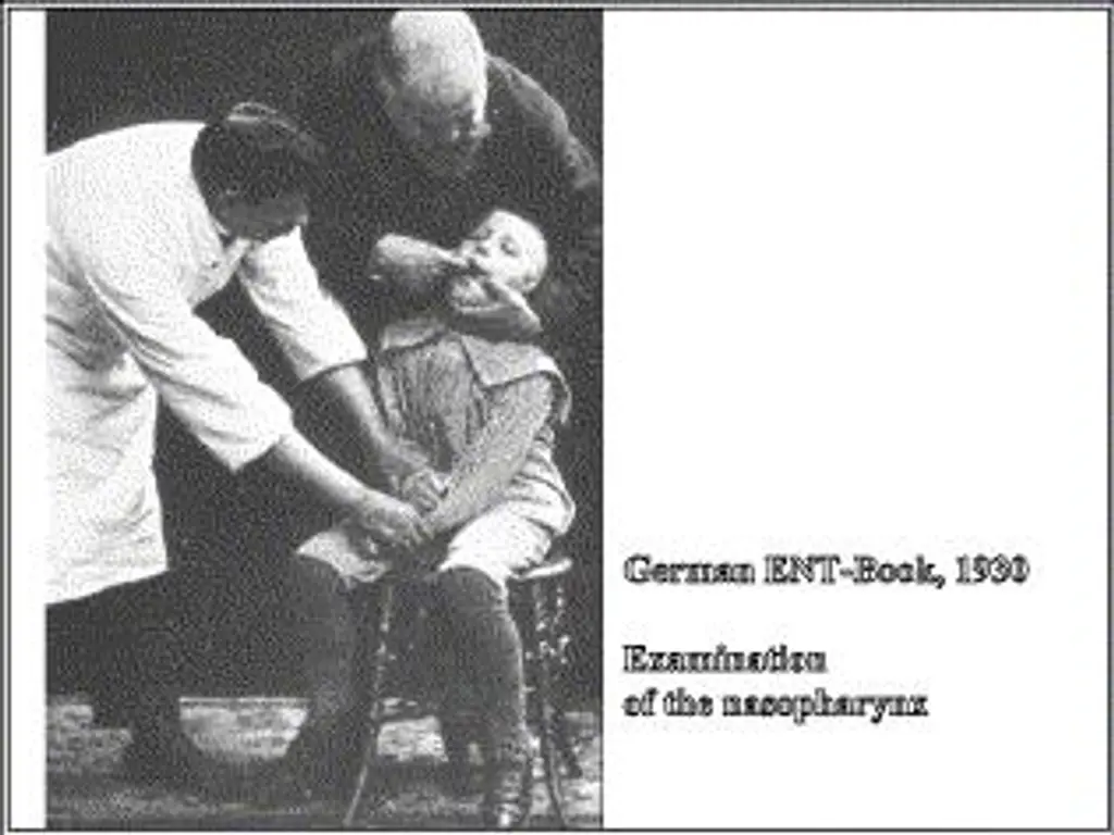 In the last century, the removal of the obstructing adenoids had become very popular like this unpleasant method to examine a child's nasopharynx by the physician (Fig. 38). Here the aggressive examination had been photographed for a German ENT book. The physician is probing the child's mouth, thrusting his index finger deeply into the throat. In order that the child cannot bite the palpating finger, the examiner's other hand pushes the skin of the child's cheeks between the rows of teeth.