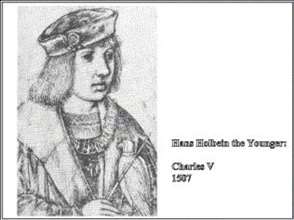 The oil painting of Charles V at age 16, by Bernard van Orley, shows an increased nasal hump, a severe progenia with angle class III malocclusion, and the protruding Habsburgian lower lip.