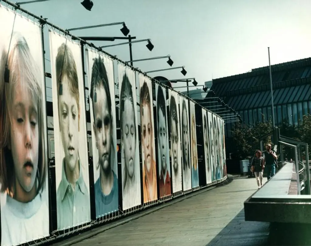 Helnwein konfrontiert die Passanten mit übergrossen Kindergesichtern in endlos scheinender Reihe.
