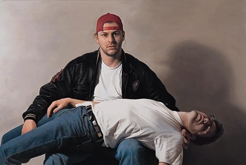 Helnwein’s Pietà is very different from the usual portrayal of Mary holding the body of Jesus as depicted by artists such as Michelangelo. Helnwein uses the posture of the typical pietà, but with the figures of Mary and Jesus replaced by a father and his son, which questions the archetypal Christian symbolism by the use of homo-erotic connotations.