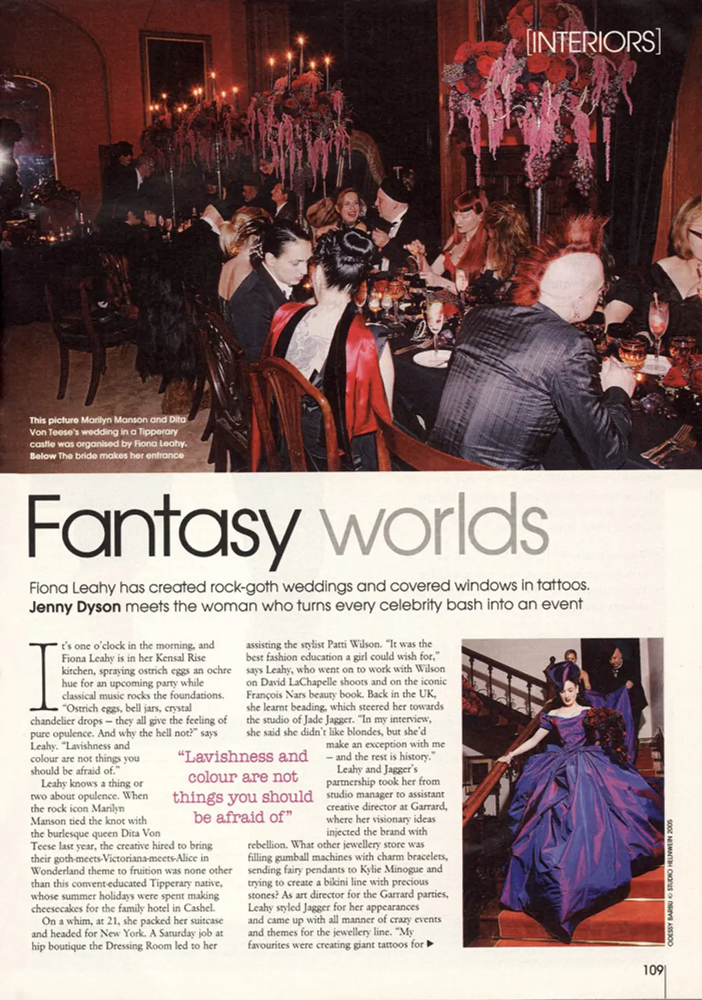 Dita Von Teese: "Bespoke - whether it's jewellery design or putting together a party - is like, 'Wow.' I love the way the Regency and Victorian era really knew how to party. There was so much attention to detail. People have become lazy about entertaining. It’s all done to a formula.” Her dream theme is a Marie Antoinette banquet. "I love centrepieces dripping with flowers, berries and fruit. In those days, people would eat the table arrangements, and 1 love that irreverence. Marilyn and Dita were such fun to work with - they let me frame their cheesy childhood photos and put them on the walls of the castle in Tipperary.