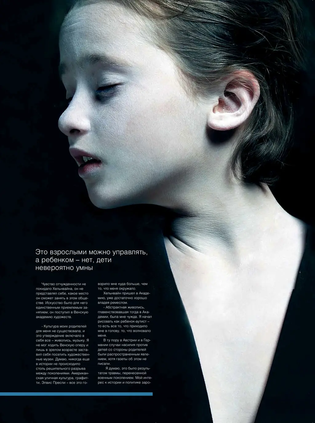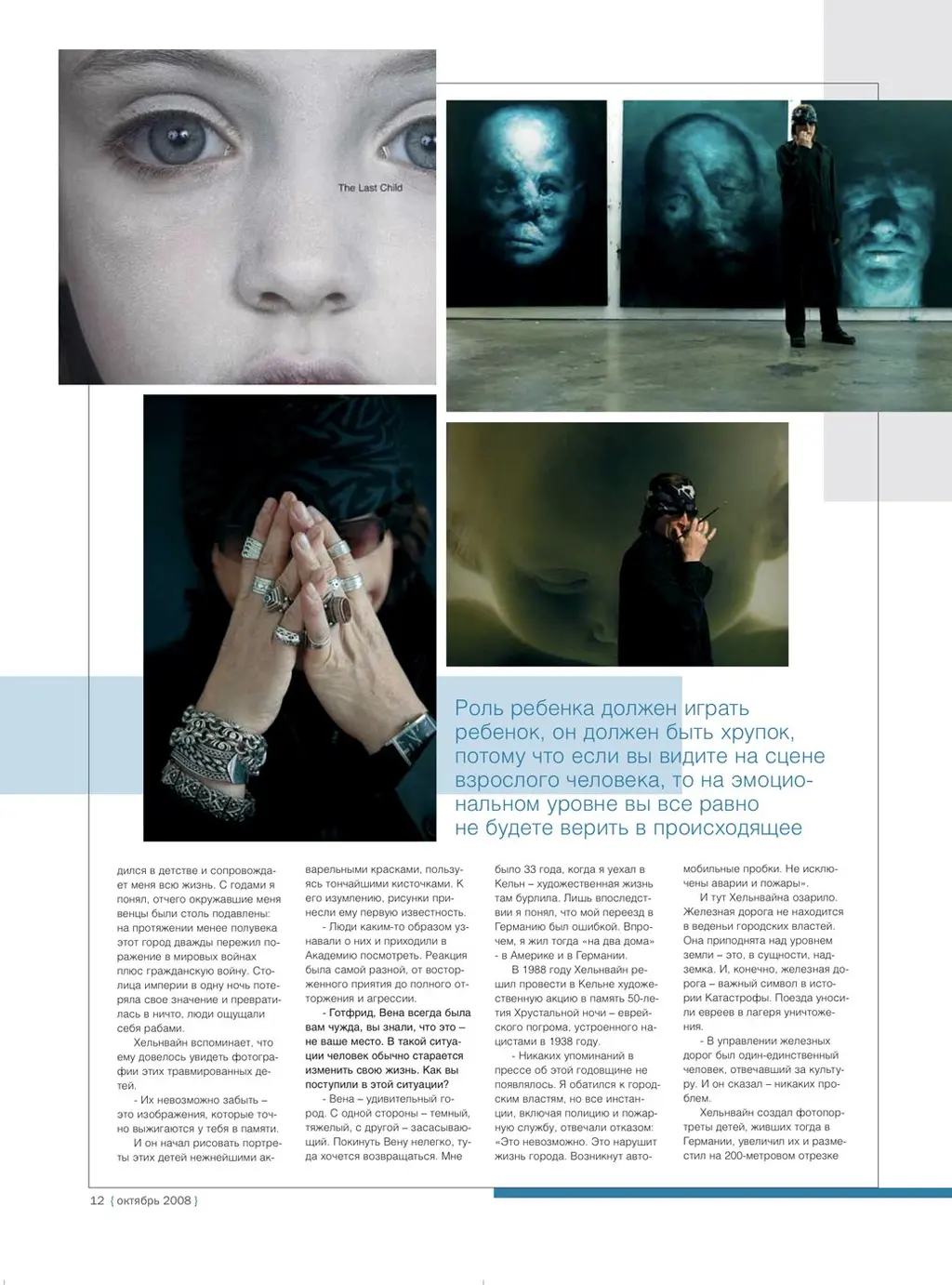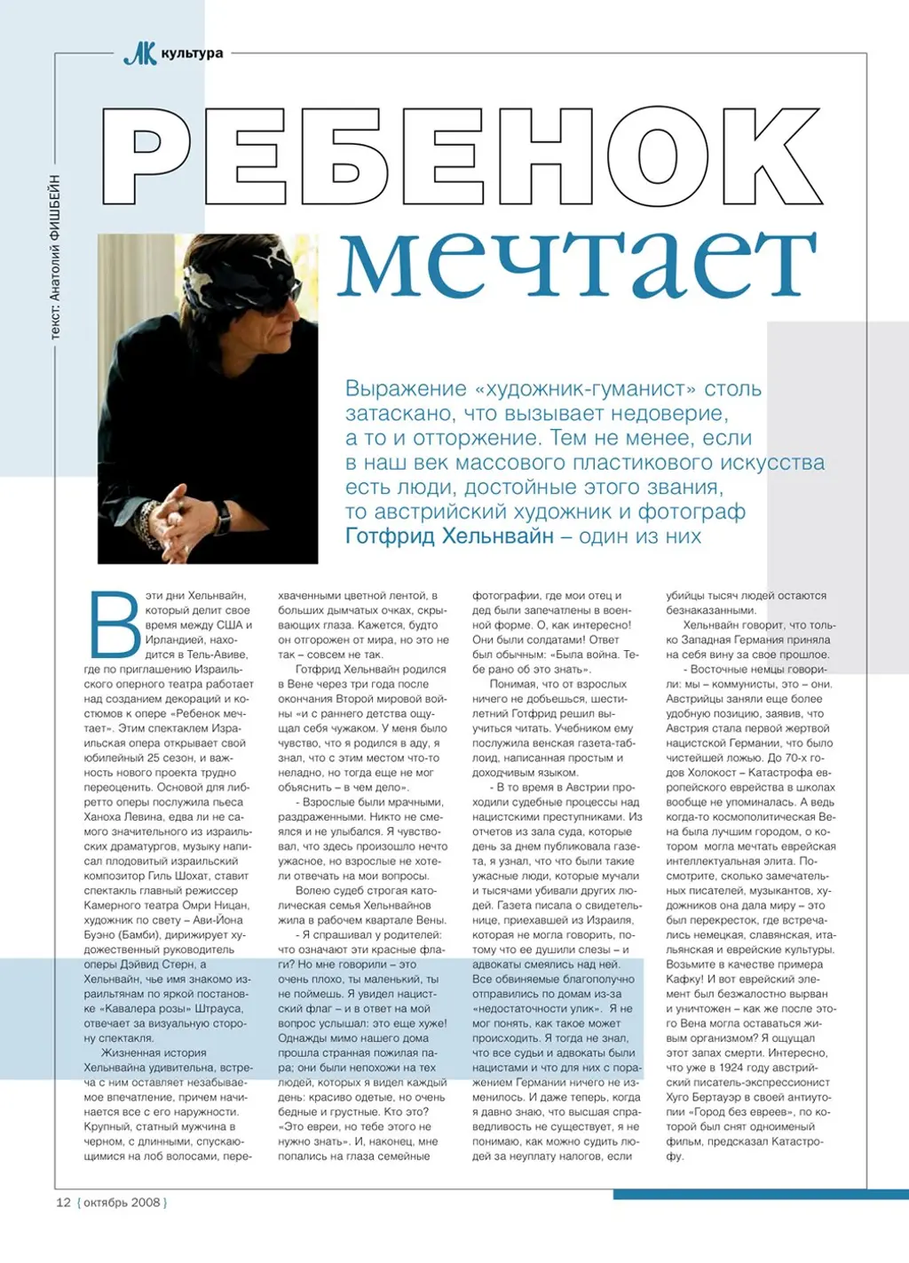 Вэти дни Хельнвайн, который делит свое время между США и Ирландией, находится в Тель-Авиве, где по приглашению Израильского оперного театра работает над созданием декораций и костюмов к опере «Ребенок мечтает». Этим спектаклем Израильская опера открывает свой юбилейный 25 сезон, и важность нового проекта трудно переоценить. Основой для либ- ретто оперы послужила пьеса Ханоха Левина, едва ли не самого значительного из израильских драматургов, музыку написал плодовитый израильский композитор Гиль Шохат, ставит спектакль главный режиссер