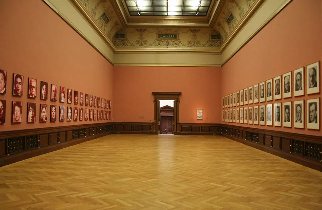 An iconic set from German painter Gerhard Richter entitled “48 Portraits” depicting 48 men based on the black and white reproductions in encyclopaedias. On the opposite wall the counterpart, also called "48 Portraits" by Austrian painter Gottfried Helnwein, showing 48 women in monochromatic red.