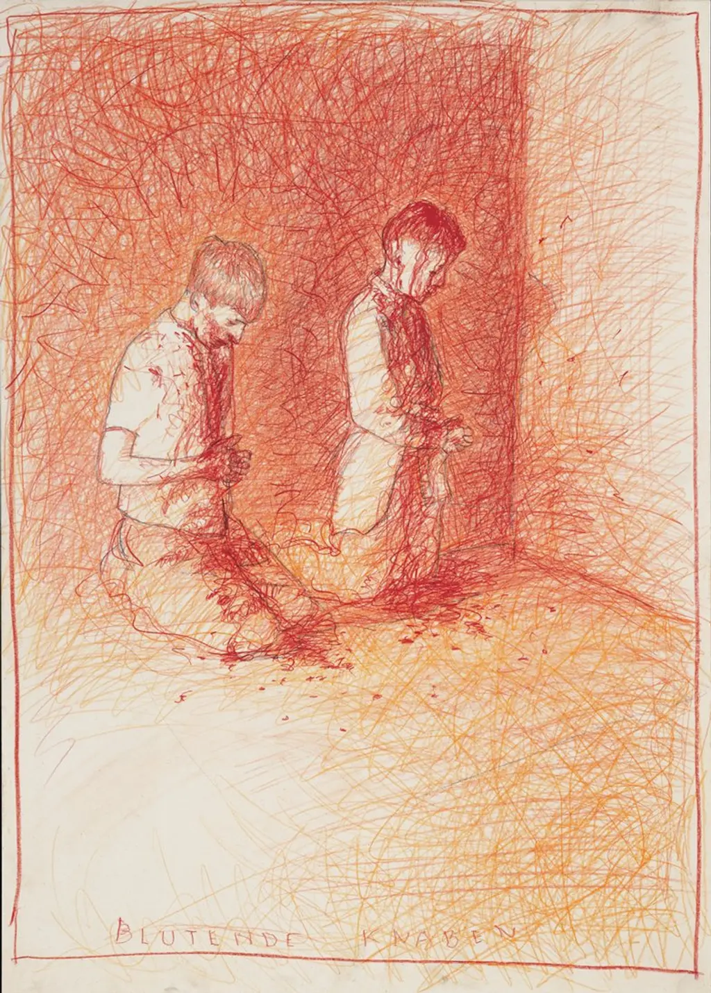 Near the end of his academic studies Helnwein made pencil drawings with classic technical knowledge. These drawings were clearly based on comics. In his works made in 1972 hilarious, caricature-like figures appear in the style of Neue Sachlichkeit. Later,his drawings made in 1975 show differences compared to the previous ones, as they are made using transparent or normal paper, with drawn or scratched figures in spaces closed by thin and dynamic lines. These lines create light-forms which fall on the figures and objects. These pictures have storylines and every figure does disturbing things on these drawings. Most of them have strange accessories: bishop hat, masks (covering their faces), machines and mechanical parts. Tubes, pits and holes are depicted inwhich the drawn figures fell or might fall into. The appearance of the surrealist features are strong in this case, events and characters don’t follow logical systems or rules.