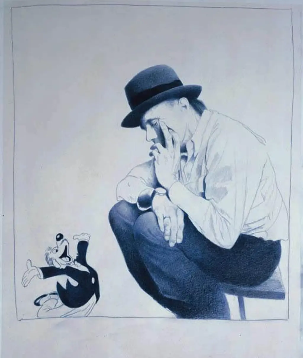 “Good comics are sacred art” –Helnwein said. He could completely identify with the Disney-creatures since his childhood. He made a series in 1993, one of them with chalk, where Picasso is depicted with a little Donald Duck. Picasso personalizes the character of the successful “modern” artist known by everyone for the wide general public. The modern art icon and the duck such as symbols appearance on a common artistic surface is one of the first manifestation of homogenization in Helnwein’s work. The two figures are bounded by the concept of mass production. Donald Duck is a mass-produced product of the game-industry, while Picasso as the avant-garde art movement’s front-line fighter, produced his own artworks in large quantity to the art market. Another piece of the series is titled The Temptation of Josef Beuys(1993. color pencil, paper 70x57 cm) [Picture 5]. Josef Beuys the iconic figure of avant-garde, one of the most significant person of the Fluxus movement contemplatively watches a little, happy Disney-figure. The displayed avant-garde artists –unquestionable “stars” of elite culture –and the Disney characters juxtaposition an accurate example of the immanent homogenization. The ensemble displaying of the motifs is not random -although it could be seen surrealistic at first sight –they’ve got a logical relation between them.