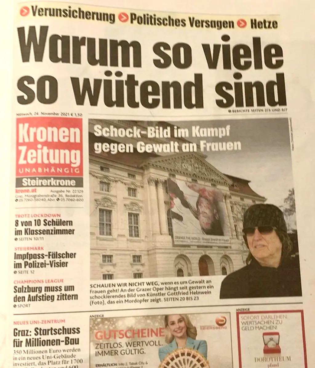 Wieso das Sujet von Helnwein so brutal ausfällt? „Helnwein hat schon immer Schmerz in seiner Kunst thematisiert“, erklärt Soran. Die Grazer Vizebürgermeisterin Judith Schwentner (Grüne) gibt zu, geschockt gewesen zu sein. „Die Fotos haben mich erschüttert, aber die Schonungslosigkeit ist notwendig. Sie hängen in der Mitte der Stadt, weil Gewalt in der Mitte der Gesellschaft passiert.“