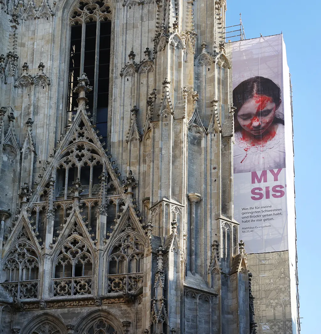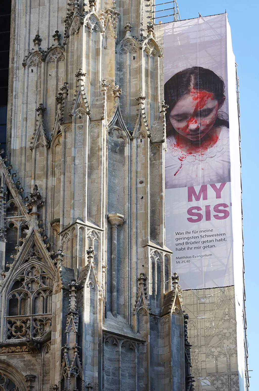 Der international bekannte Künstler Gottfried Helnwein setzt am Stephansdom ein Zeichen gegen Gewalt an Frauen und Mädchen. Ab Dienstag wird am Südturm des Doms ein großflächiges Plakat angebracht, auf dem der immer wieder mit Schockeffekten arbeitende gebürtige Wiener ein verletztes Mädchen mit Blutflecken darstellt. Darunter die um Empathie werbende Aufschrift "My Sister" und das Jesuswort aus dem Matthäusevangelium "Was ihr für meine geringsten Schwestern und Brüder getan habt, habt ihr mir getan" (Mt 25,40).