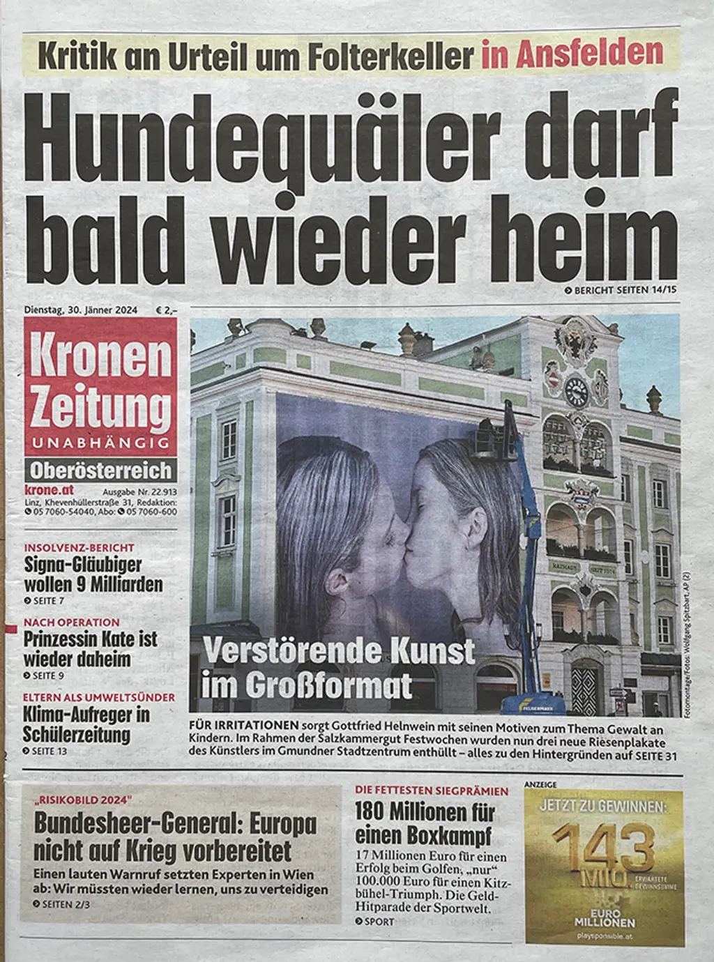 Wenige Stunden später hängt das zweite Motiv: Ein Kind in einer SS-Uniform. Dann kam der Künstler Gottfried Helnwein vorbei – er weilt derzeit in Gmunden – und entdeckte, dass seine Schockbilder seitenverkehrt angebracht worden waren. Alles retour und noch mal, aber nun richtig!