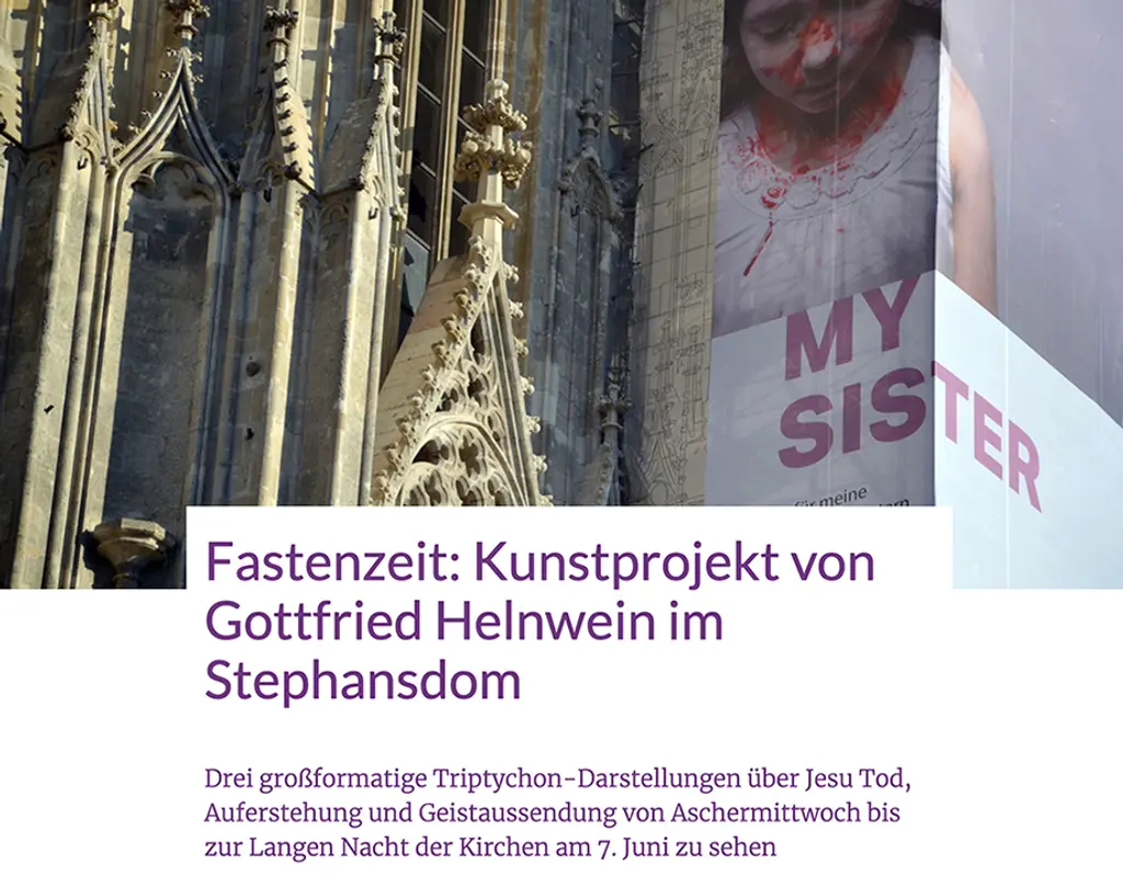 In der Fastenzeit und weit darüber hinaus ist ein Kunstprojekt des österreichischen und international renommierten Künstlers Gottfried Helnwein im Wiener Stephansdom zu sehen. Auf Einladung der Dompfarre und mit Zustimmung des Domkapitels setzt Helnwein in diesem Jahr die Reihe von Kunstinstallationen für die österliche Bußzeit und den Osterfestkreis fort. In jeweils drei großformatigen Triptychon-Darstellungen wird der Künstler das christliche Zentralgeheimnis von Jesu Tod, Auferstehung und Geistaussendung darstellen, wie es auch im christlichen Glaubensbekenntnis formuliert ist, hieß es in einer Ankündigung am Donnerstag. Das dreiteilige Kunstwerk wird ab Aschermittwoch bis zur Langen Nacht der Kirchen am 7. Juni zu sehen sein, wobei die Präsentation in drei Schritten erfolgt.