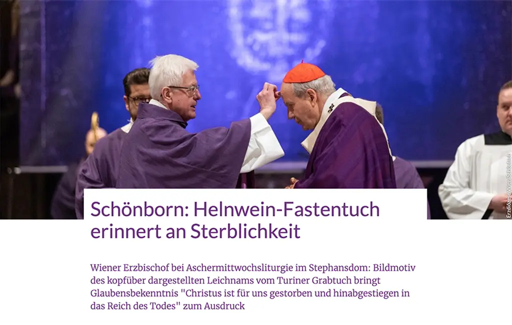 Die Fastenzeit erinnert den Menschen an seine Sterblichkeit - die zugleich auch die Hauptaussage des Fastentuch-Triptychons von Gottfried Helnwein im Stephansdom ist. Darauf hat Kardinal Christoph Schönborn bei der Aschermittwochsliturgie in der Wiener Domkirche hingewiesen. Was im dreiteiligen Fastentuch des Künstlers dargestellt sei, korrespondiere mit dem Aschenritus, der in der katholischen Kirche mit den Worten "Bedenke Mensch, dass du Staub bist und zu Staub zurückkehrst" vollzogen wird, erläuterte der Wiener Erzbischof.