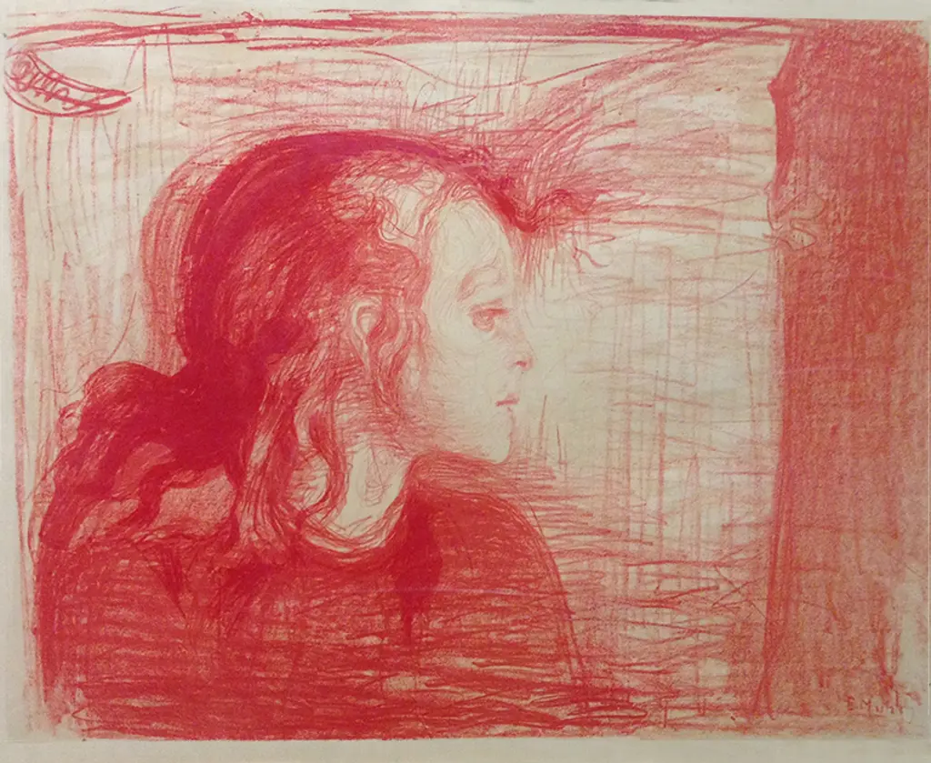 Es ist eigentlich das ewige Thema meiner eigenen Arbeiten, das kranke, verwundete, das beschädigte Kind, das blasse, anämische Mädchen, verletzlich, hilflos, und ausgeliefert. Mir fällt eigentlich kein Kunstwerk ein, das so viel Empathie in mir auslöst, wie diese Zeichnung von Edvard Munch. Am liebsten würde ich dieses zerbrechliche Geschöpf festhalten, es wärmen und es beschwören, nicht aufzugeben, nicht loszulassen, seinen Geist nicht auszuhauchen.