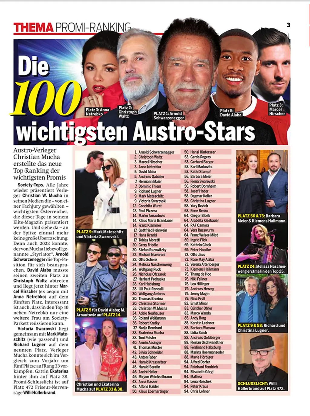 Verleger Christian Mucha erstellt das neue Top-Ranking der wichtigsten Promis.Alle jahre wieder präsentiert Verleger Christian W. Mucha in seinen Medien die - von einer Fachjury gewählten - wichtigsten Österreicher.