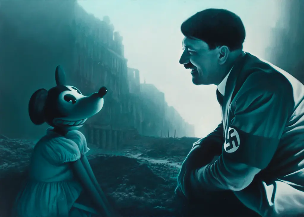 Und so sind es vielleicht gar nicht die überlebensgroßen Kinder mit den blutverschmierten Gesichtern oder den Maschinenpistolen im An-schlag, die am heftigsten schockieren. Sondern das Bild eines entspannt lächelnden Adolf Hitlers, der gegenüber einer zähnefletschenden Minnie Mouse in die Hocke geht. Hinter ihm befinden sich die Schutt- und Leichenberge einer kriegszerstörten Stadt. „Encounter 2 (Der Mann, der lacht)" heißt die Arbeit, die davon erzählt, wie sich der Massenmörder von seinem an-strengenden Tagwerk erholt: mit Donald Duck-Filmen. Die Banalität des Bösen trifft mitten ins Herz. Donald Duck und sein Zeichner Carl Barks spielen eine prägende Rolle in Helnweins Biographie. Aufgewachsen im engen katholischen Milieu des noch russisch besetzten Nachkriegs-Wiens beschreibt er die Begegnung mit den