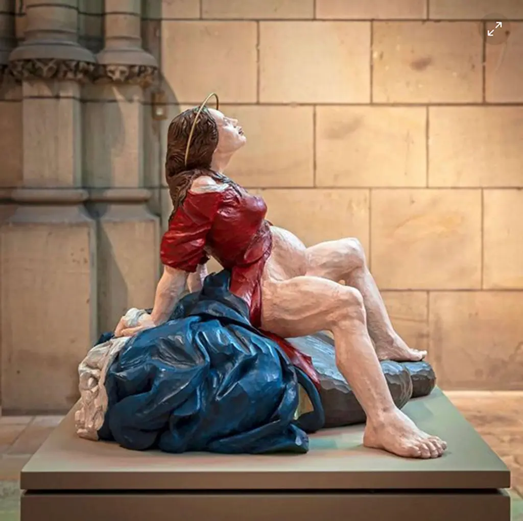 Die Skulptur, um die es geht, trägt den Titel Crowning ("Krönung") und enthält damit einerseits eine Anspielung auf die Krönung der heiligen Maria, andererseits auf einen spezifischen Moment des menschlichen Geburtsvorgangs. Sie zeigt eine gebärende Maria, mit gespreizten Beinen auf einem Felsen sitzend, im Moment des Geburtsvorgangs, in dem das Köpfchen des Kindes bereits sichtbar, aber noch fest vom Körper der Gebärenden umschlossen ist. Ausgestellt wurde die Figur im Rahmen des Projektes "DonnaStage", einem Format, das sich anlässlich des 100-jährigen Weihejubiläums des Mariendoms in Linz in Form von Installationen, Workshops und Diskussionsveranstaltungen explizit mit Frauenrollen, Familienbildern und Geschlechtergerechtigkeit befasst.