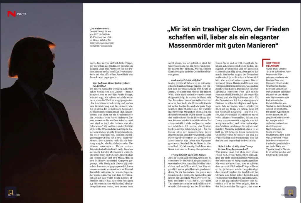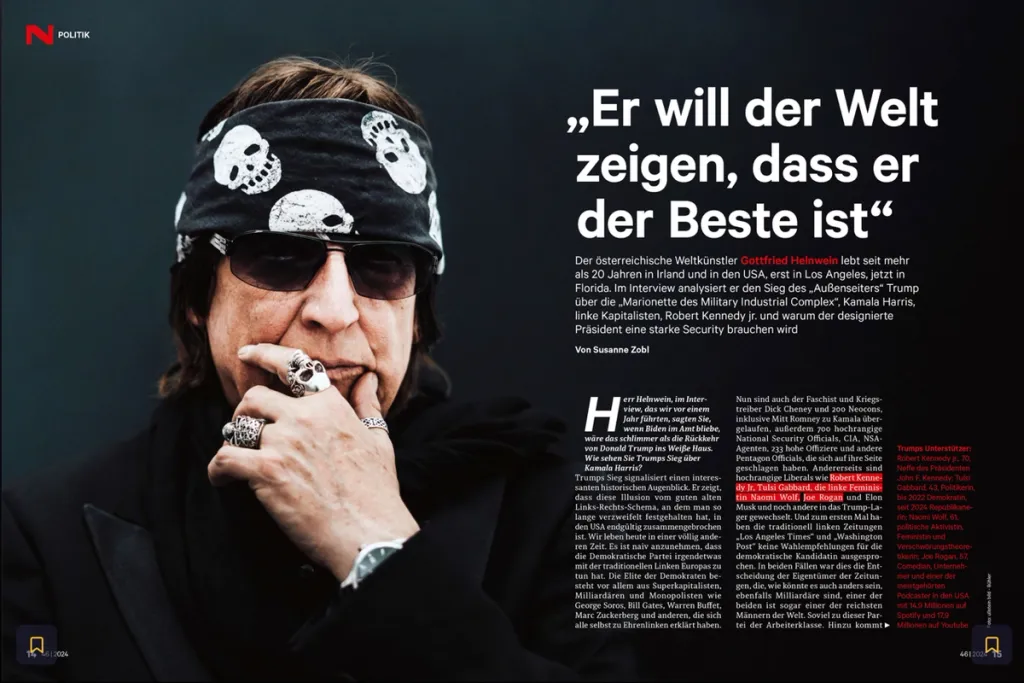 Herr Helnwein, im Interview, das wir vor einem Jahr führten, sagen Sie, wenn Biden im Amt bliebe, wäre das schlimmer als die Rückkehr von Donald Trump ins Weiße Haus. Wie sehen Sie Trumps Sieg über Kamala Harris?