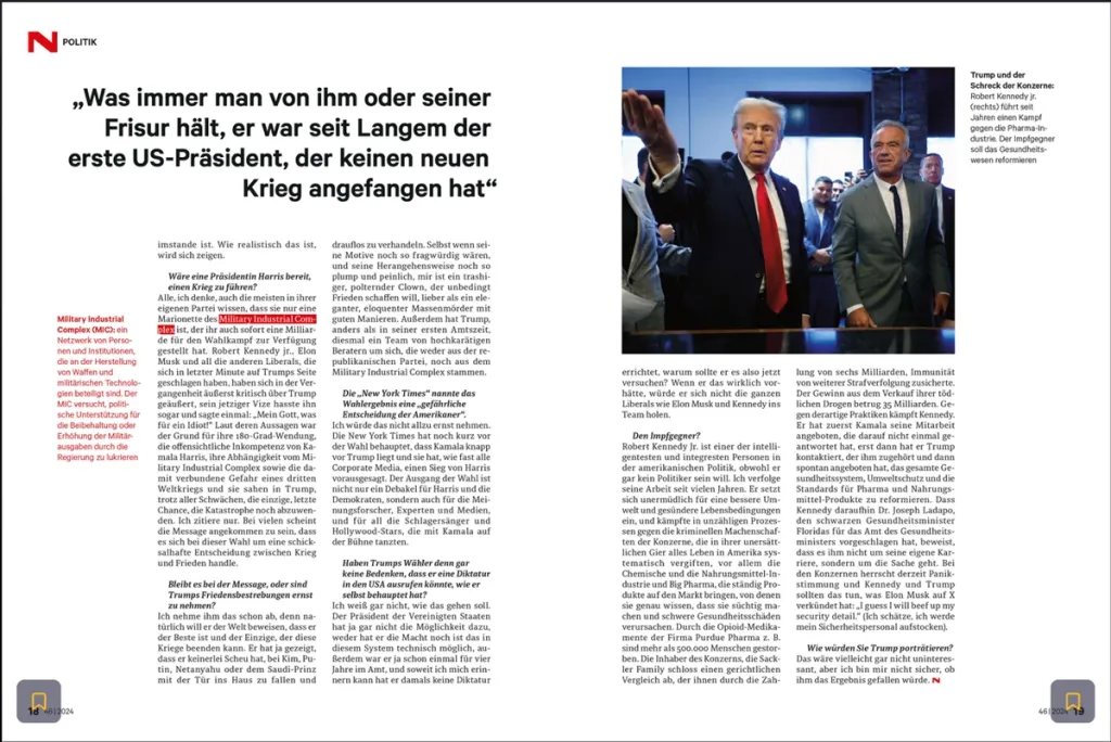 Laut deren Aussagen war der Grund für ihre 180 Grad Wendung, die offensichtliche Inkompetenz von Kamala Harris, ihre Abhängigkeir vom Miltarary Industrial Complex und die damit verbundene Gefahr eines dritten Weltkrieges und sie sahen in Trump, trotz aller Schwächen, die einzige, letzte Chance die Katastrophe noch abzuwenden. Ich zitiere nur.